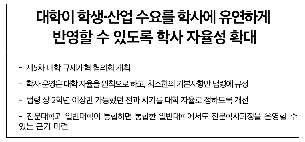 전문대와 4년제 일반대가 통합한 대학에서는 학사 과정과 전문학사 과정을 모두 운영할 수 있게 된다고 하는데 교육부는 2023년 4월 26일 제5차 대학 규제개혁협의회를 열고 '학생·산업수요 중심 학사 제도 개선 방안'을 논의했다고 밝혔습니다.