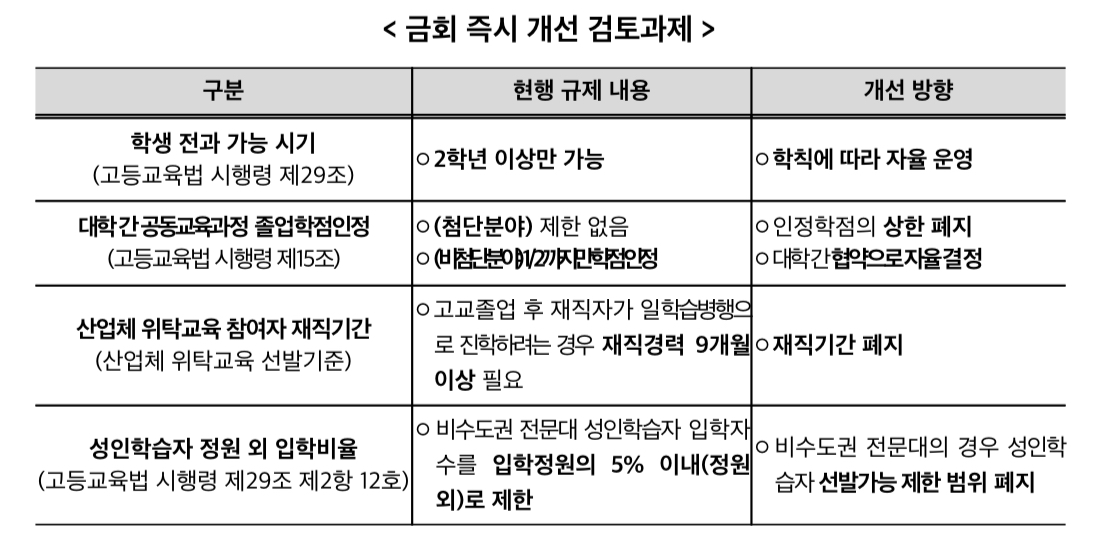 아울러 현재 입학정원의 5% 이내로 제한된 비수도권 전문대의 정원 외 성인 학습자 입학 비율도 폐지될 전망입니다.