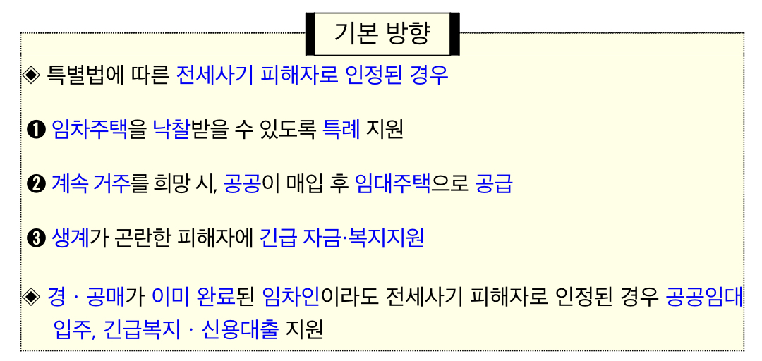 본 특별법에 따라, 전세사기 연관성, 피해의 심각성 등을 위원회 심의를 통해 판단하여 전세사기 피해자로 인정된 자를 대상으로 우선매수권 등의 특례를 부여하고 희망 시 LH에서 우선매수권을 양도받아 해당 임차주택을 매입한 후 공공임대주택으로 제공하는 한편, 세제ㆍ금융 등 지원을 추진한다고 합니다.