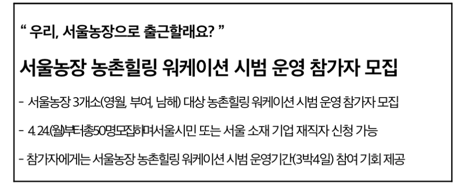 서울시는 ‘서울농장 농촌힐링 워케이션’ 시범 운영에 참여할 참가자 총 50여 명을 2023년 4월 24일부터 5월 5일 18시까지 모집합니다.