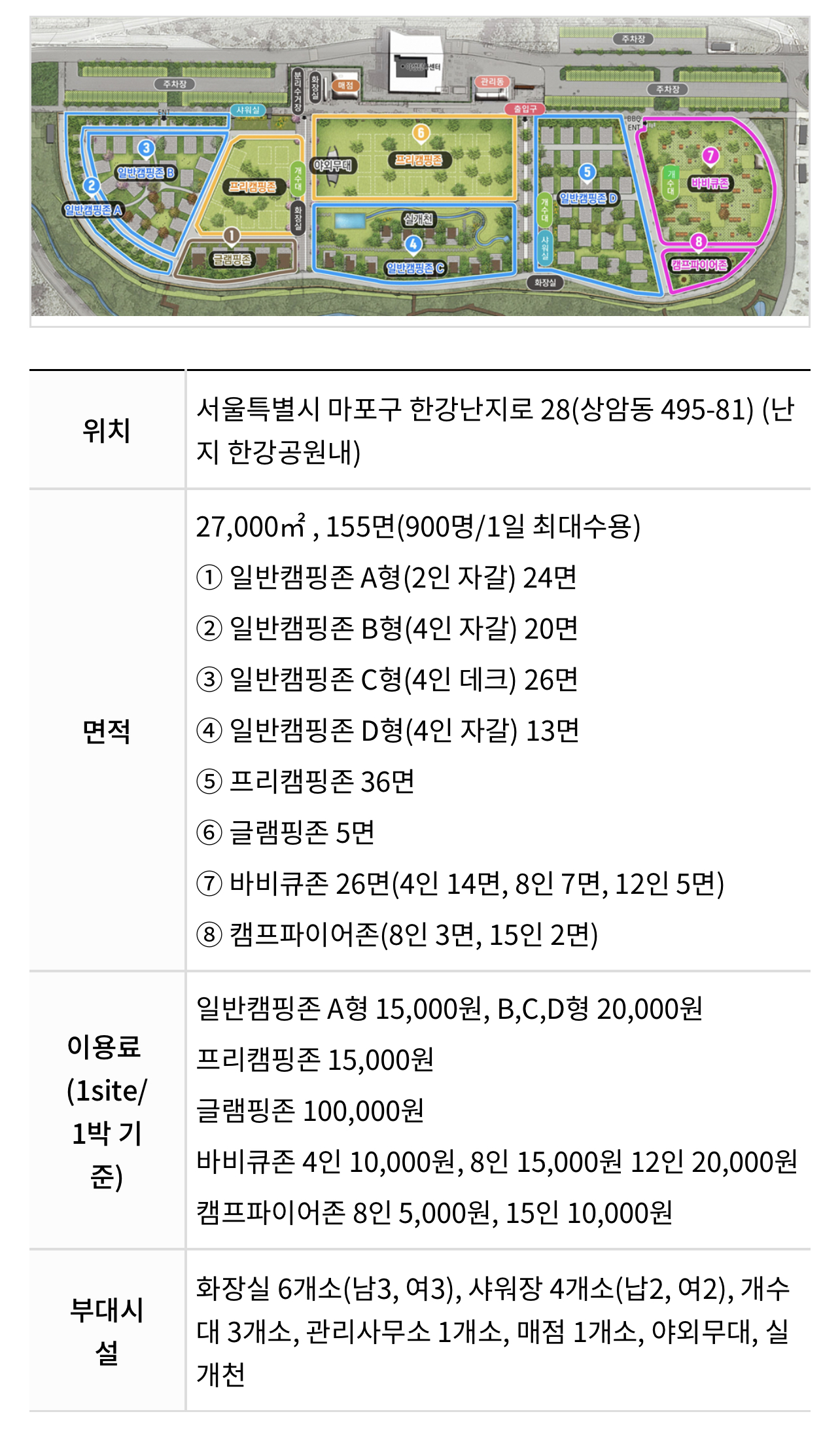 난지캠핑장 요금, 구역, 부대시설 정보