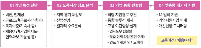 · 고용여건 향상이 필요한 기업은 인사·노무 컨설팅, 작업환경 개선, 기업 인지도 제고 등 다양한 지원정책 연계