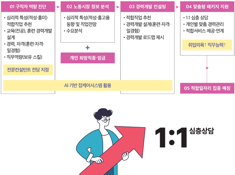 · 개인별 전담 컨설턴트가 AI 기반 분석시스템(잡케어)을 활용하여 구직자의 직무역량을 진단·분석