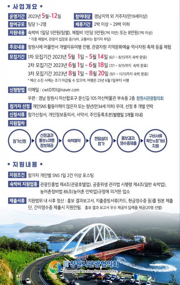 창원시는 참가팀당 하루 5만원의 숙박비와 여행 기간 내 인당 5만~8만원의 체험비를 지원합니다.