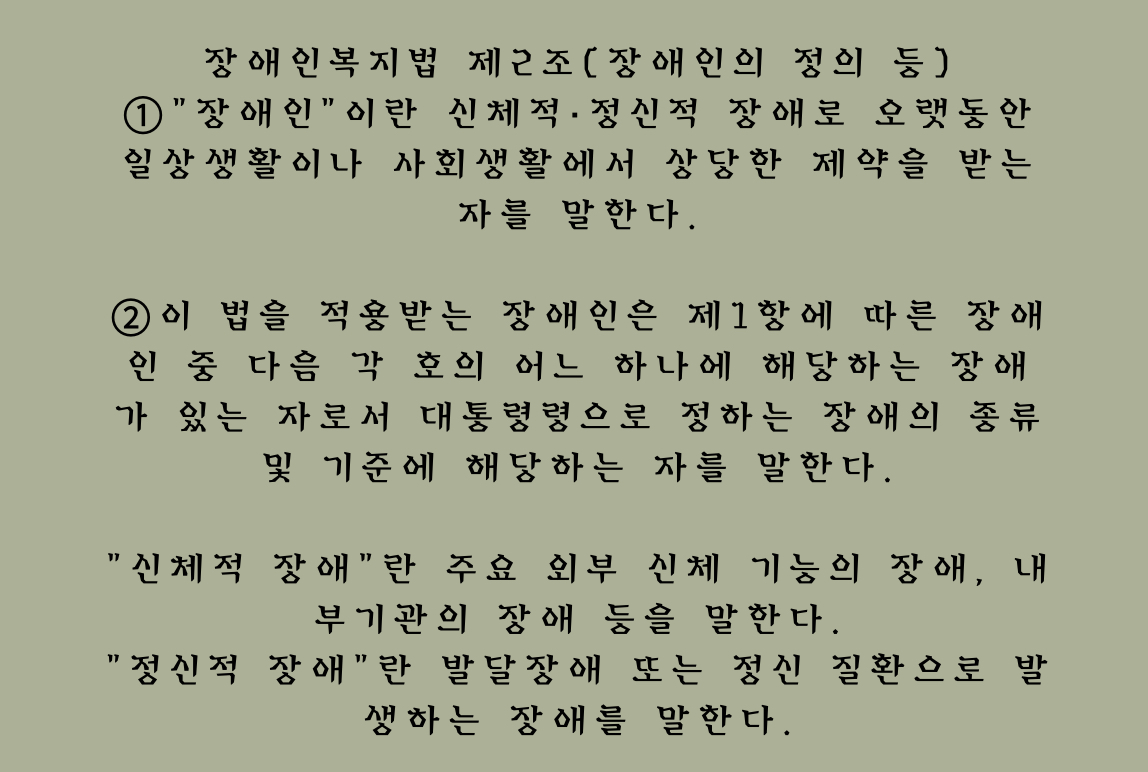 ①“장애인”이란 신체적·정신적 장애로 오랫동안 일상생활이나 사회생활에서 상당한 제약을 받는 자를 말한다.
