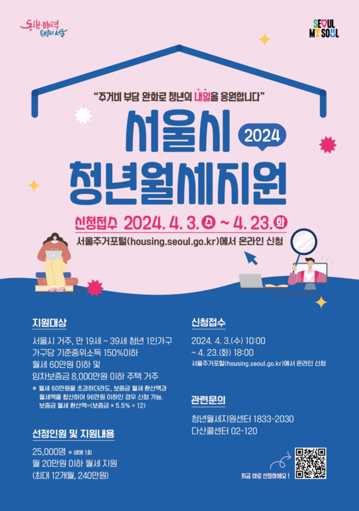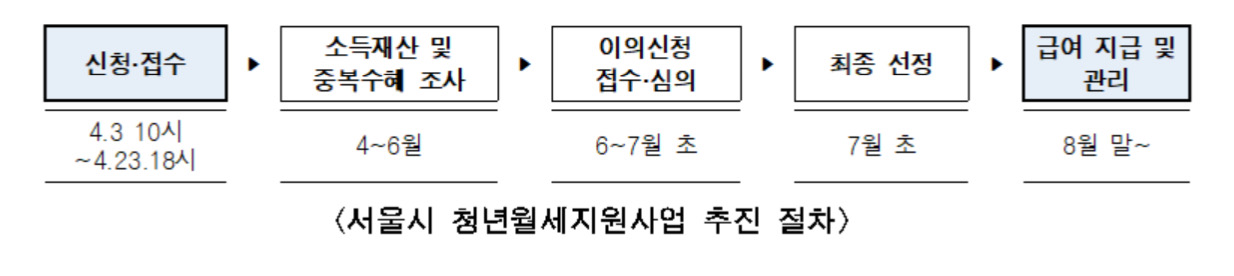 서울 청년월세지원 신청은 2024년 4월 3일 오전 10시부터 23일 오후 6시까지 3주간 서울주거포털을 통해 할 수 있습니다