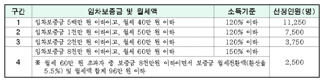 임차보증금 8000만원 이하 및 월세 60만원 이하 건물에 월세로 실제 거주하고 있어야 하며, 신청자의 일반 재산이 1억 3000만 원을 초과해서는 안됩니다.