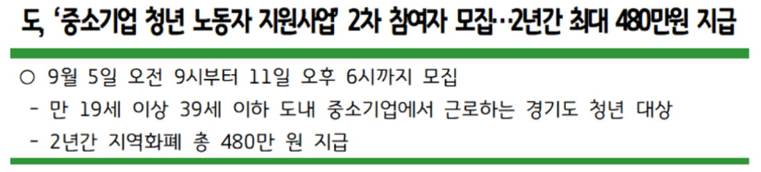 경기도가 ‘중소기업 청년 노동자 지원사업’ 2차 참여자 2,700명을 모집한다고 밝혔습니다.