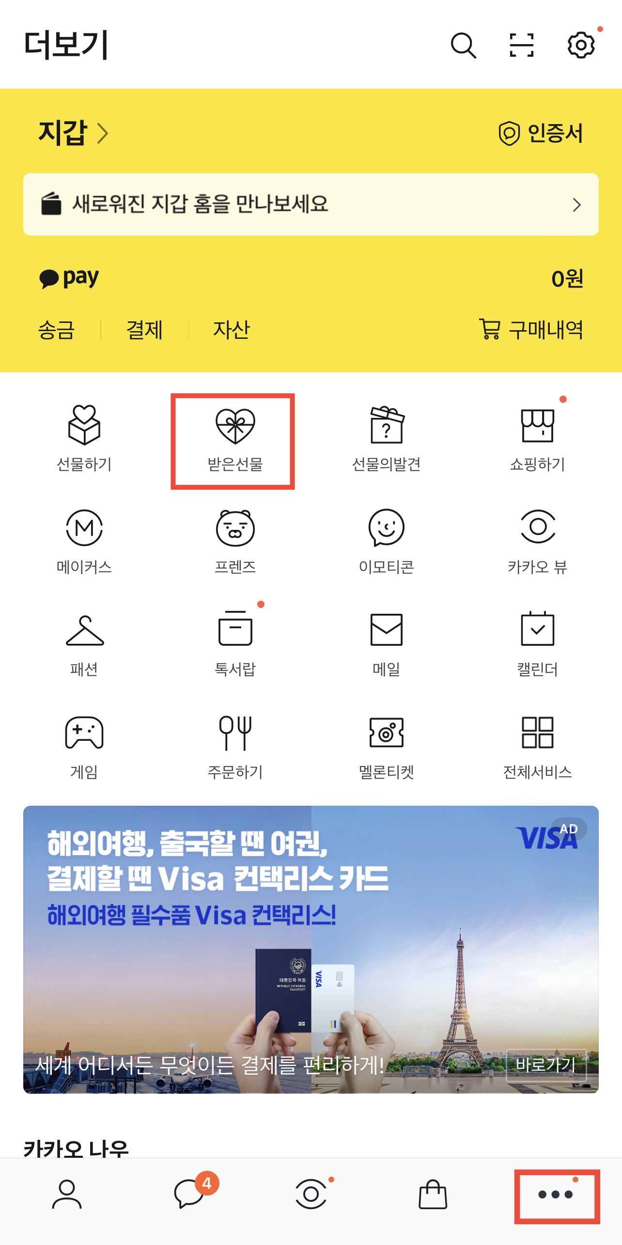 1. 카톡 접속 후 우측 하단에 ...메뉴 클릭 하시고 그러고나서 받은선물을 누르시면 상대방이 님에게 준 선물함을 몽땅 확인하실수 있습니다.