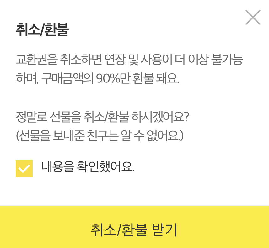 참고하실 점은 상대방이 준 카톡 선물 기프티콘 등 교환권을 취소하면 연장 및 사용이 더 이상 불가능 하며 구매금액의 90%만 환불됩니다.