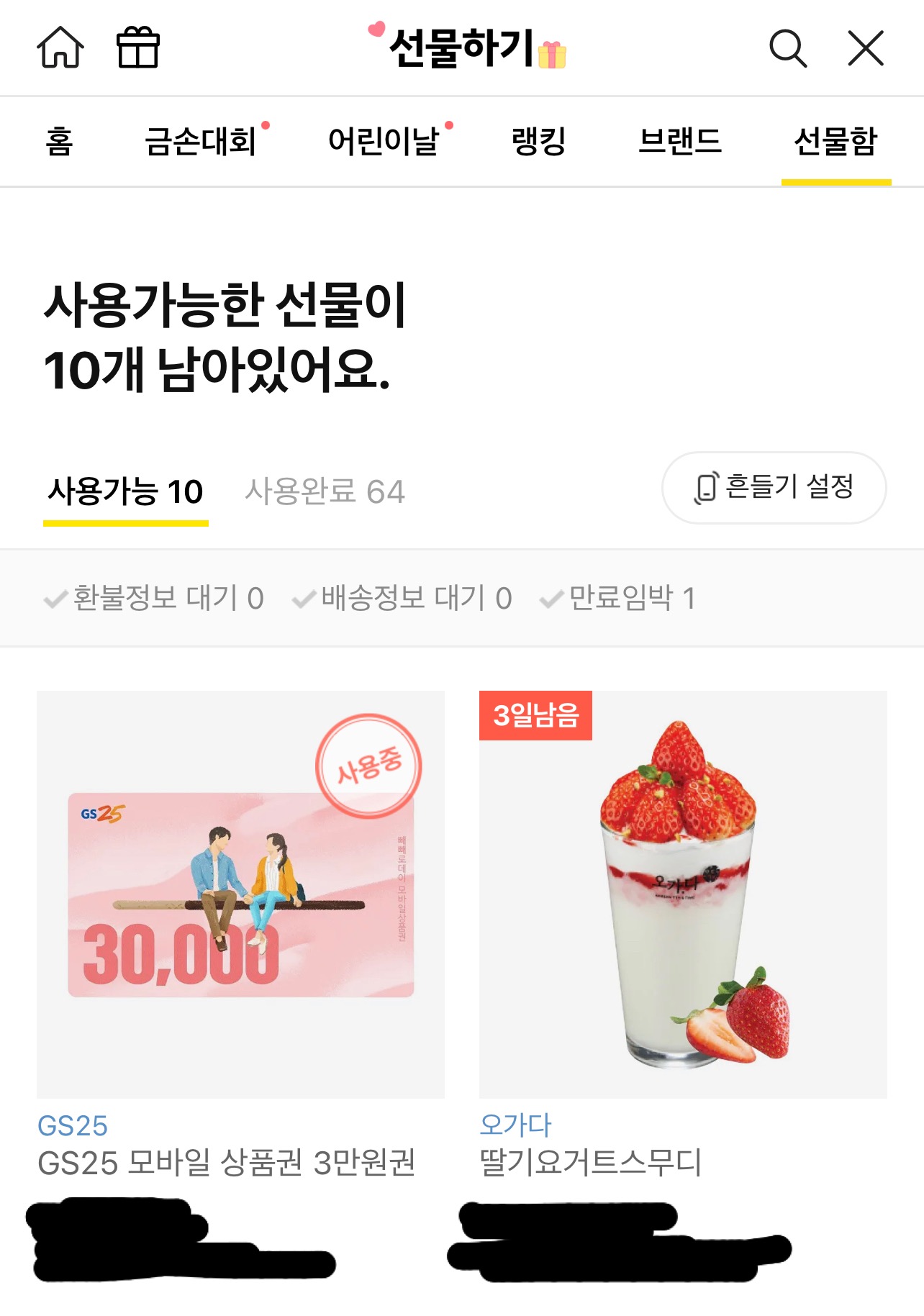 2. 그리고 나서 상대방이 준 선물 중에 환불할 제품을 선택해 주시면 취소/환불 탭 선택이 보이실텐데 그걸 눌러서 환불을 하시길 바랍니다.