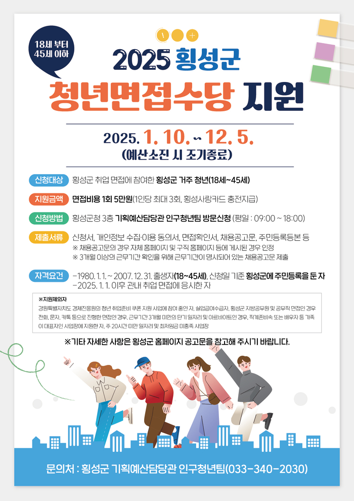 지역 청년들의 취업 준비를 돕고 구직활동을 장려하기 위해 횡성군이 ‘2025년 청년 면접수당 지원사업’을 시행한다고 합니다.