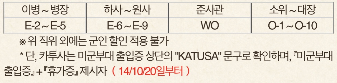 * 신분증마다 양식이 상이 할 수 있으나, 하단의 Grade(직위)표시자에 한하여 할인 적용 가능 (15/04/06일부터)