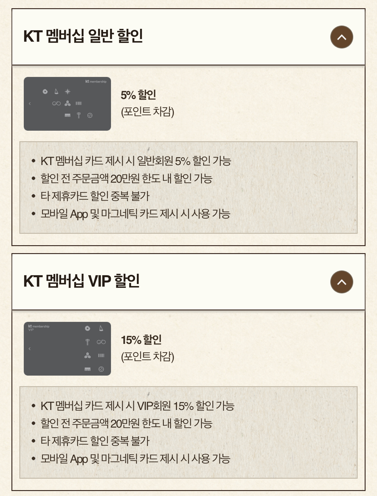 • KT 멤버십 카드 제시 시 VIP회원 15% 할인 가능