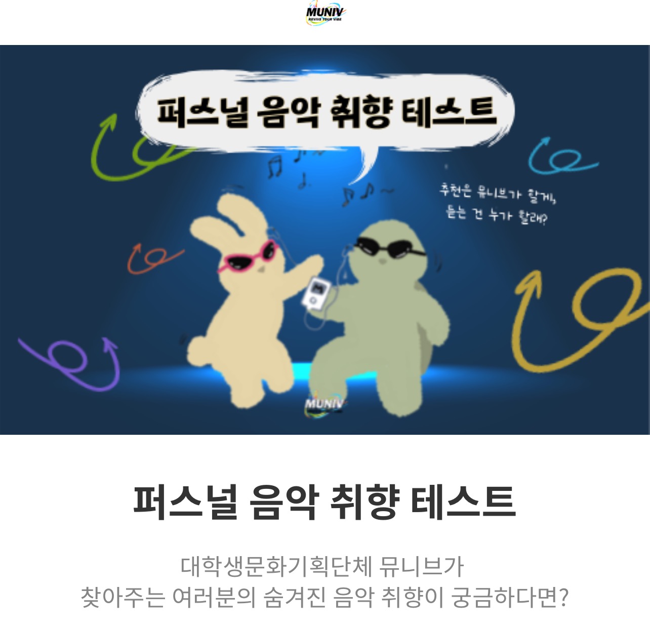 남녀노소 누구나 자기가 좋아하는 음악 하나쯤은 존재할텐데 대학생문화기획단체 뮤니브가 찾아주는 여러분의 숨겨진 음악 취향 찾아주는 테스트가 있어서 소개드리려 합니다.