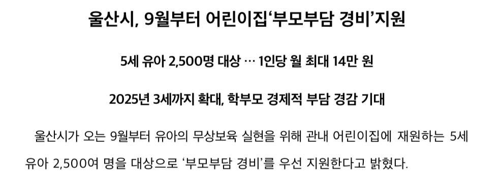울산시는 어린이집 유형(국공립, 민간·가정)이나 부모의 재산 및 소득에 관계없이 아동 1인당 월 최대 14만 원(연 168만 원)까지 지원한다고 합니다.