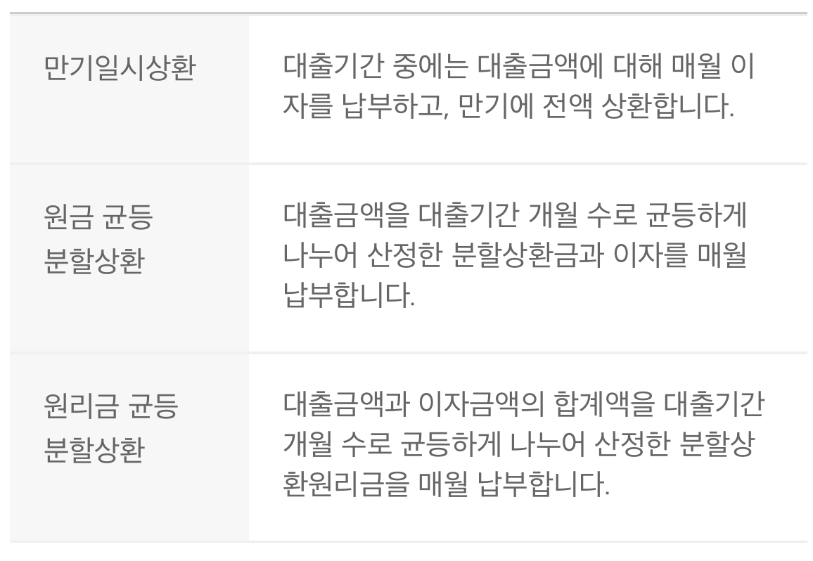 만기일시상환: 대출기간 중에는 대출금액에 대해 매월 이자를 납부하고, 만기에 전액 상환합니다.