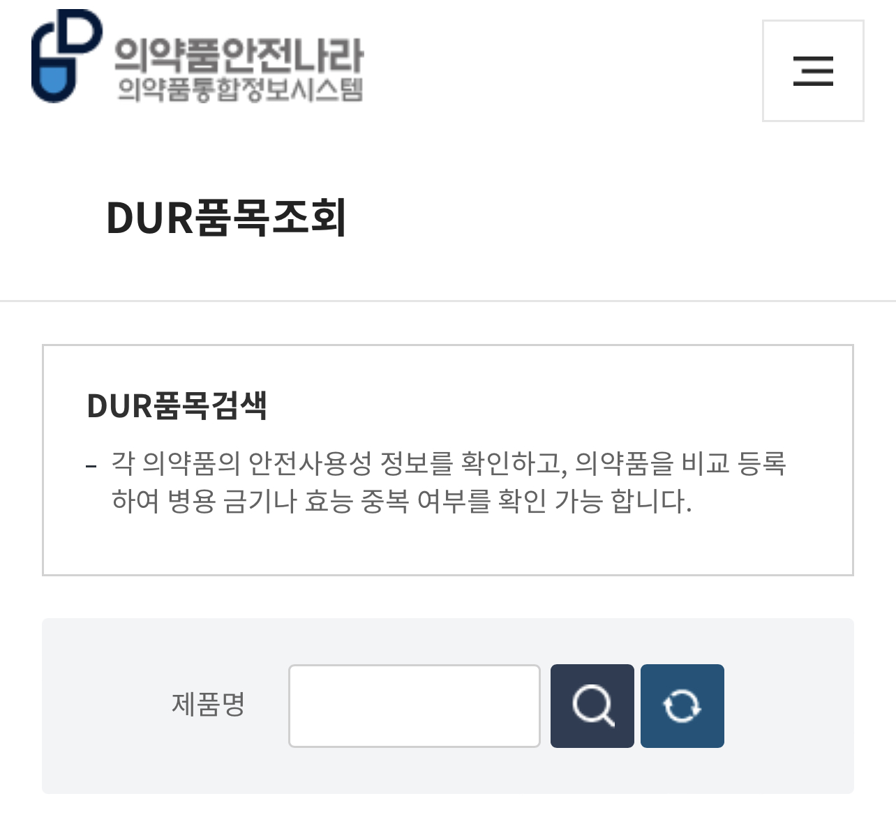 의약품안전나라에서 의약품 등 정보, 의약품(DUR) 정보에 들어가면 자신이 복용하고 있는 약을 검색할 수 있으며 복용 중인 여러 약들을 담으면 함께 복용하면 안 되는지 확인할 수 있습니다.