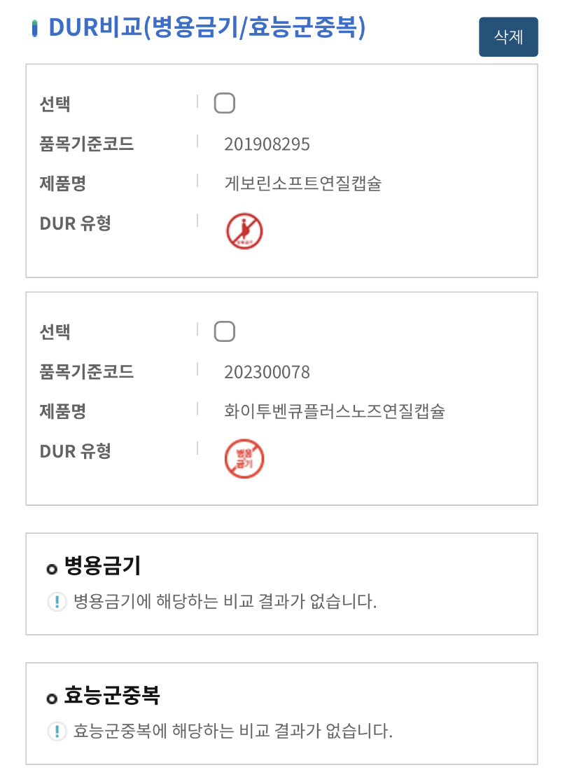 이때 의약품 안전사용서비스인 DUR을 사용하면 집에서도 본인이 먹는 약들을 검색해 병용금기약물인지 확인할 수 있습니다.