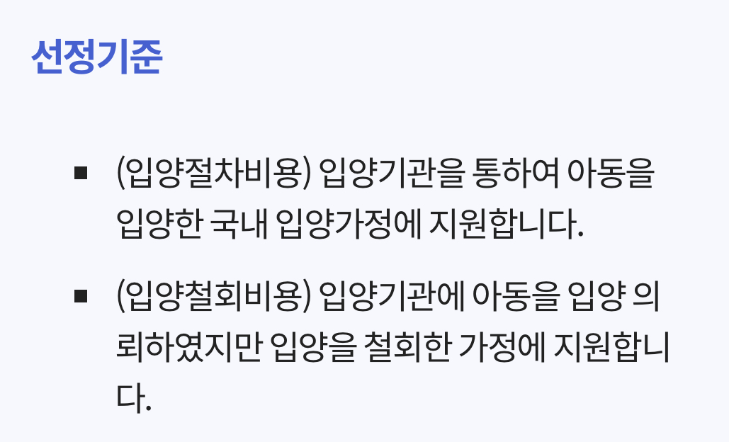■(입양철회비용) 입양기관에 아동을 입양 의뢰하였지만 입양을 철회한 가정에 지원합니다.