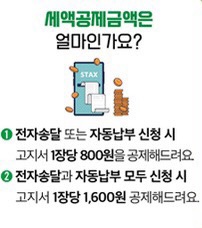 주민세(개인분), 재산세, 자동차세, 등록면허세에 대해 전자송달 또는 자동납부를 신청하면 고지서 1장당 800원이 할인되고 전자송달과 자동납부까지 신청할 경우에는 1,600원의 세액공제 혜택을 받을 수 있습니다.