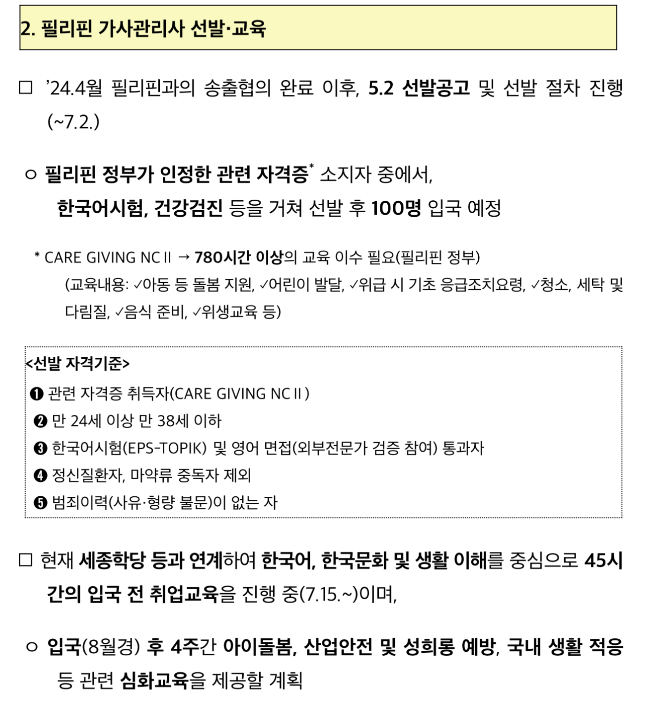 외국인 가사관리사는 필리핀 정부가 공인한 관련 케어기버 자격증(780시간 이상 교육 이수) 소지자 중에서 영어·한국어 등 어학능력 평가, 건강검진, 범죄이력 확인 등 신원검증을 거쳐 100명이 선발되었다고 합니다.
