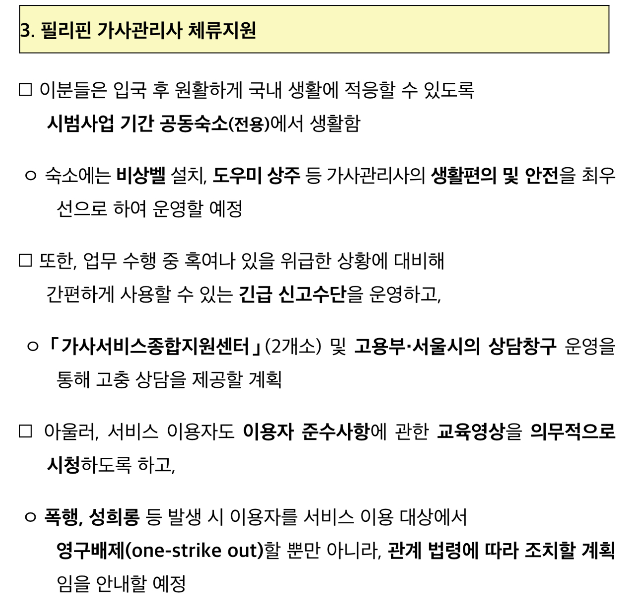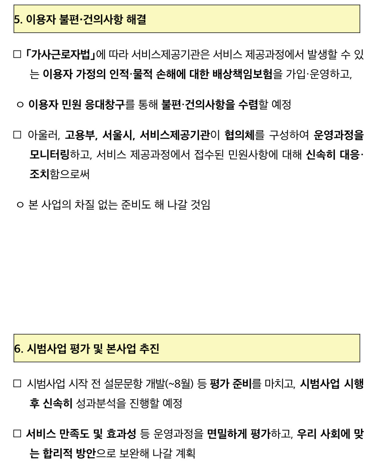 서울시와 고용부는 2024년 9월 본격적인 서비스 제공에 앞서 민원·고충처리 창구 운영 등 체계적인 관리 시스템도 갖춰, 이용자 만족도를 높이고 외국인 가사관리사도 충실하게 보호하도록 지원한다는 계획이라고 합니다.