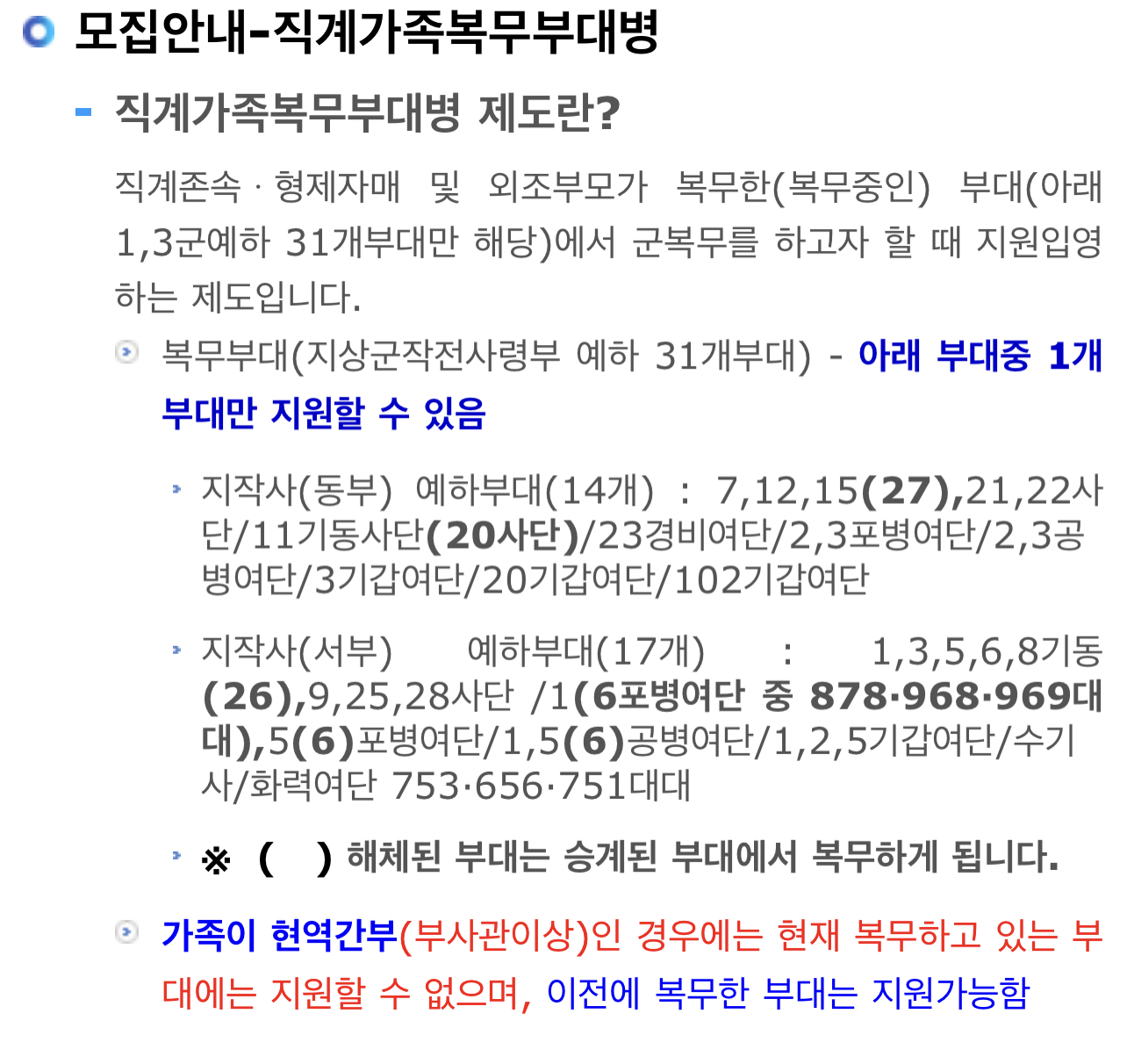 육군 직계가족복무부대병 제도란 직계존속ㆍ형제자매 및 외조부모가 복무한(복무중인) 부대(아래 1,3군예하 31개부대만 해당)에서 군복무를 하고자 할 때 지원입영하는 제도입니다.