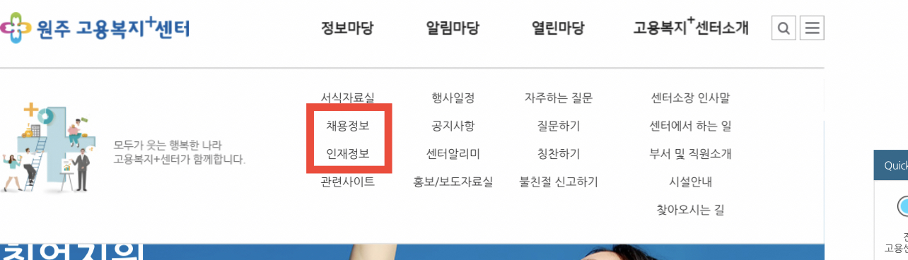 그러고 나서 사진과 같이 정보마당에 채용정보 및 인재정보가 나오는데 이를 통해서 정규직, 계약직 및 현장, 사무, 조리원, 생산직 등 다양한 일자리 정보를 얻을 수 있습니다.
