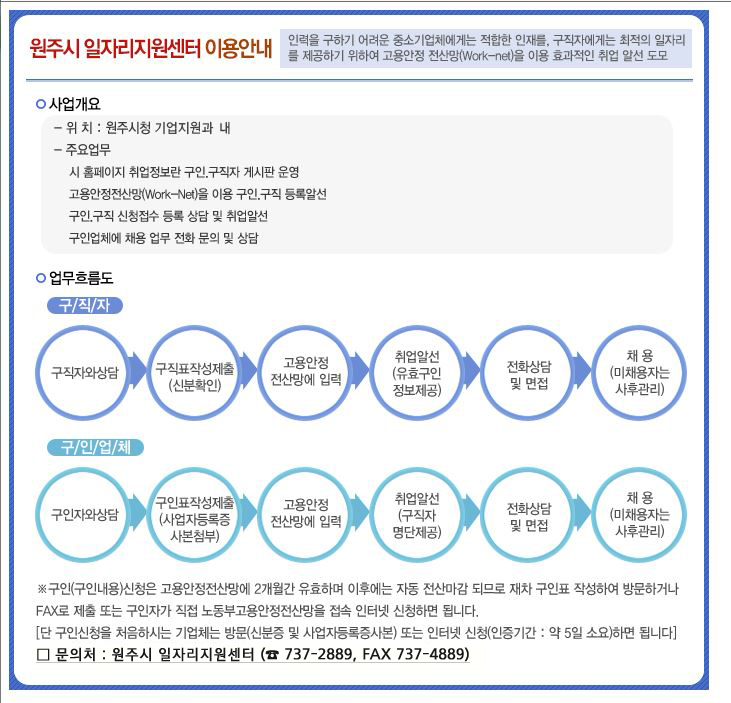 홈페이지에 구인광고를 원하시면 직접 원주시 일자리 지원센터 (☎ 737-2889/2884~7)에 방문하여 구인표를 작성하시거나, 팩스(737-4889)를 통하여 홍보를 의뢰할 수 있습니다.