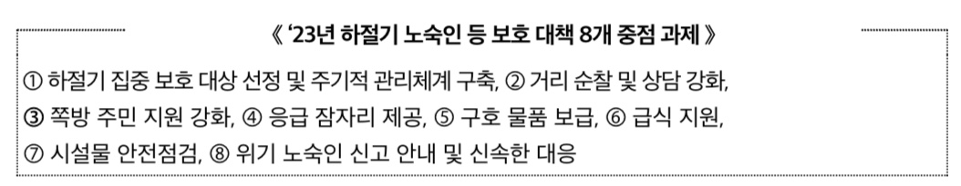 2023년 하절기 보호 대책 기간은 2023년 6월 1일(목)부터 9월 30일(토)까지 이며 7월과 8월은 집중 보호 기간으로 주・야간 순찰을 더욱 확대하거나 무더위쉼터의 24시간 개방 등을 통해 보호를 강화할 계획이라고 합니다.