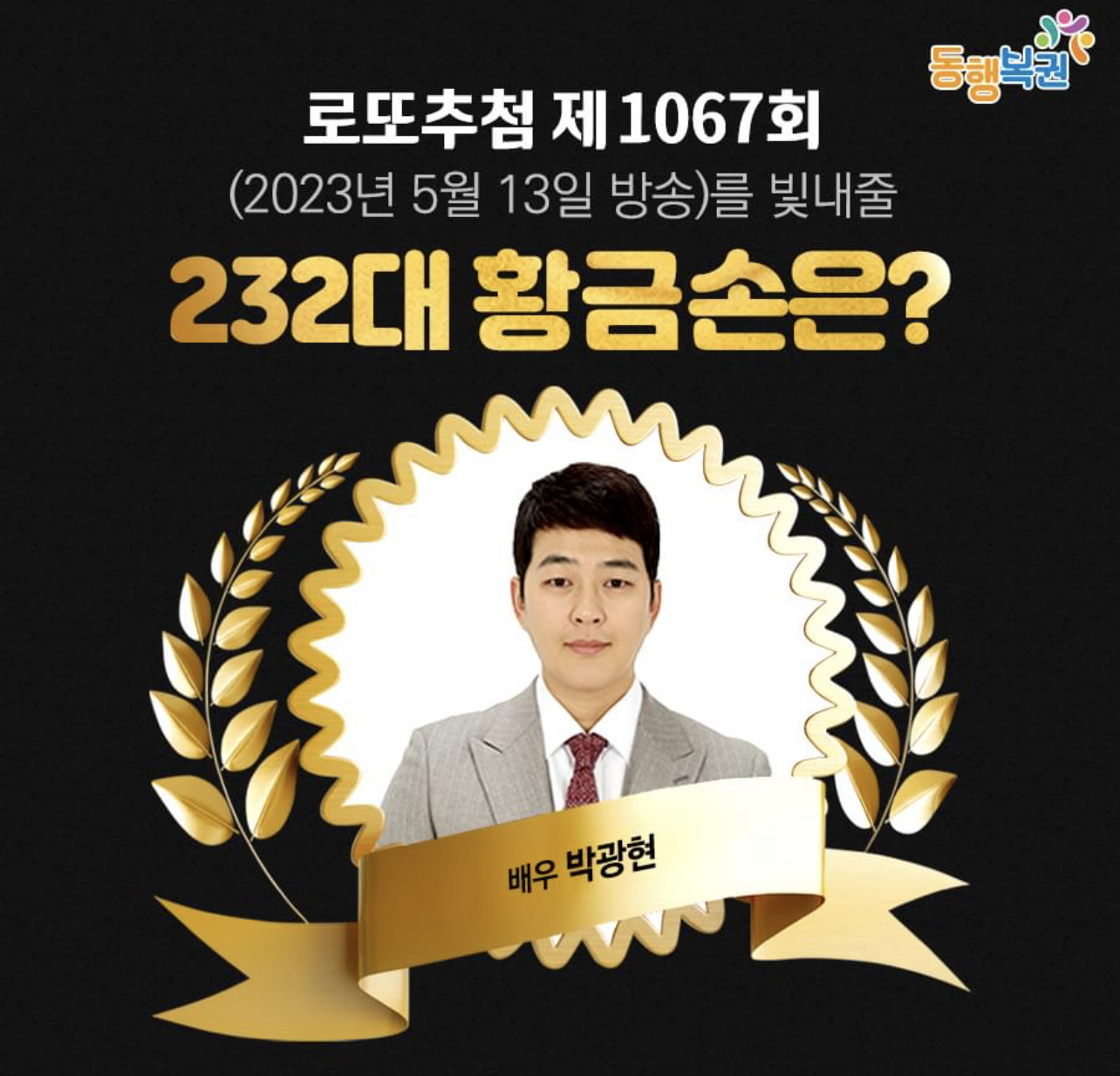 이번주 동행복권 로또 1067회 당첨번호 발표 로또 방송시간에 연기부터 선행까지 다재다능한 배우 박광현이 로또 황금손으로 출연한다고 합니다.
