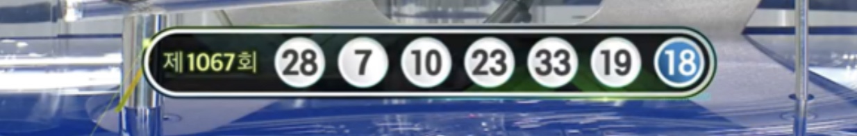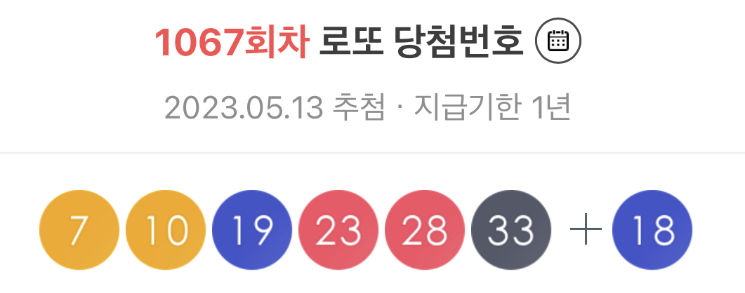1067회 로또 당첨번호 조회 결과 7, 10, 19, 23, 28, 33번