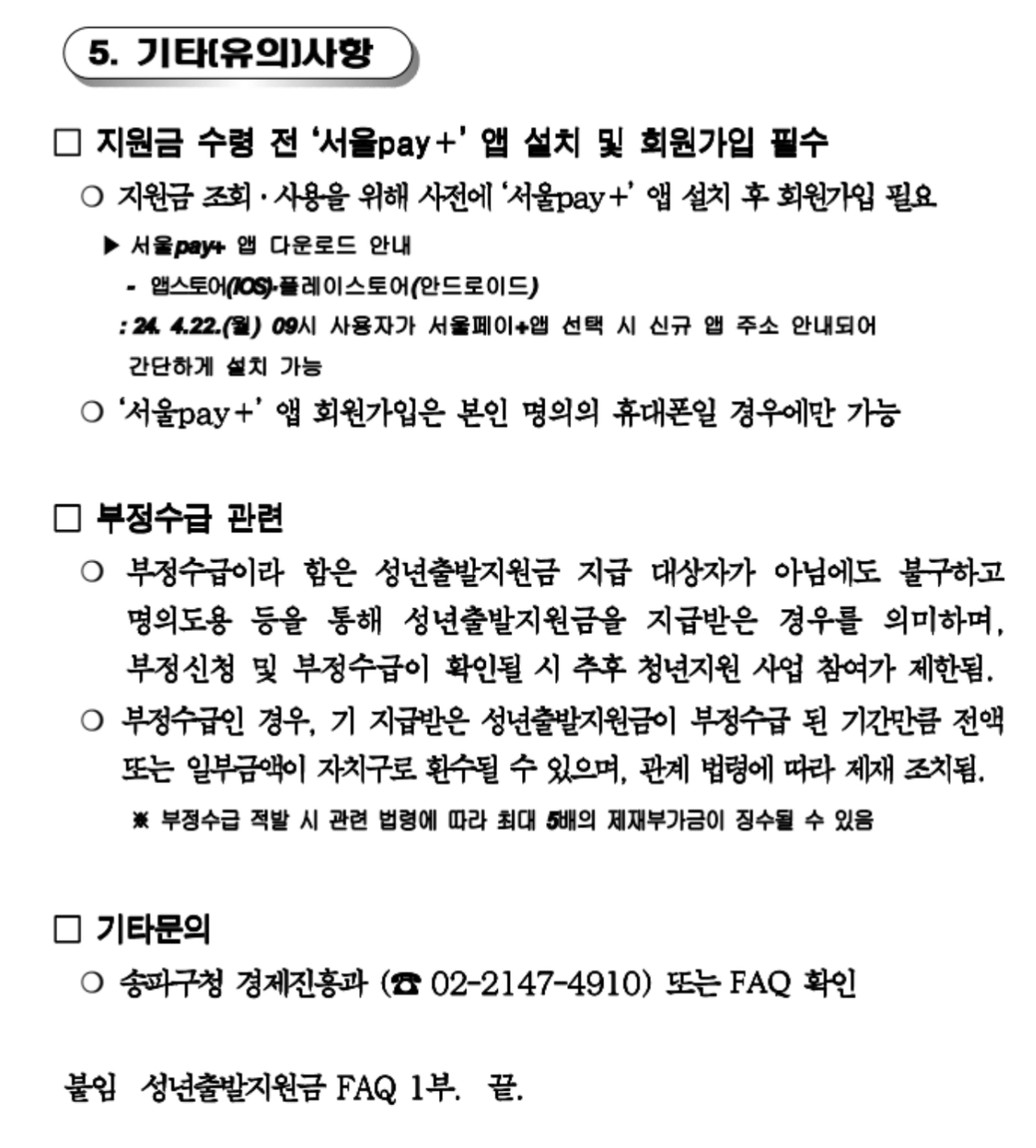 기타 문의사항은 4월 22일부터 송파구청 누리집 고시공고 및 FAQ를 확인하거나 송파구청 경제진흥과(02-2147-4910)로 문의하면 됩니다.