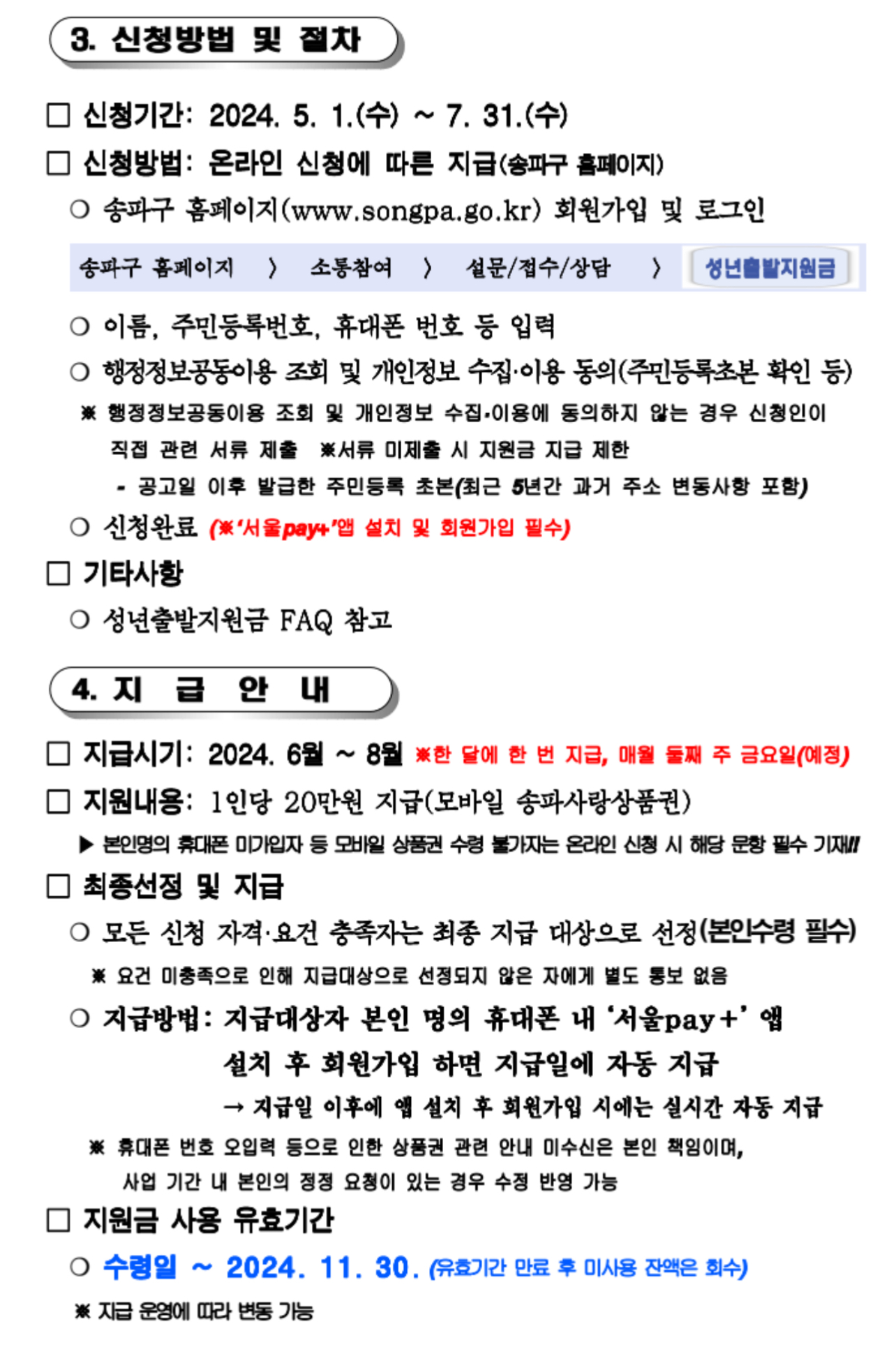 ※ 송파구청 홈페이지 신청 후 대상자 휴대폰에 ‘서울pay+’ 앱 설치 및 회원가입 필수