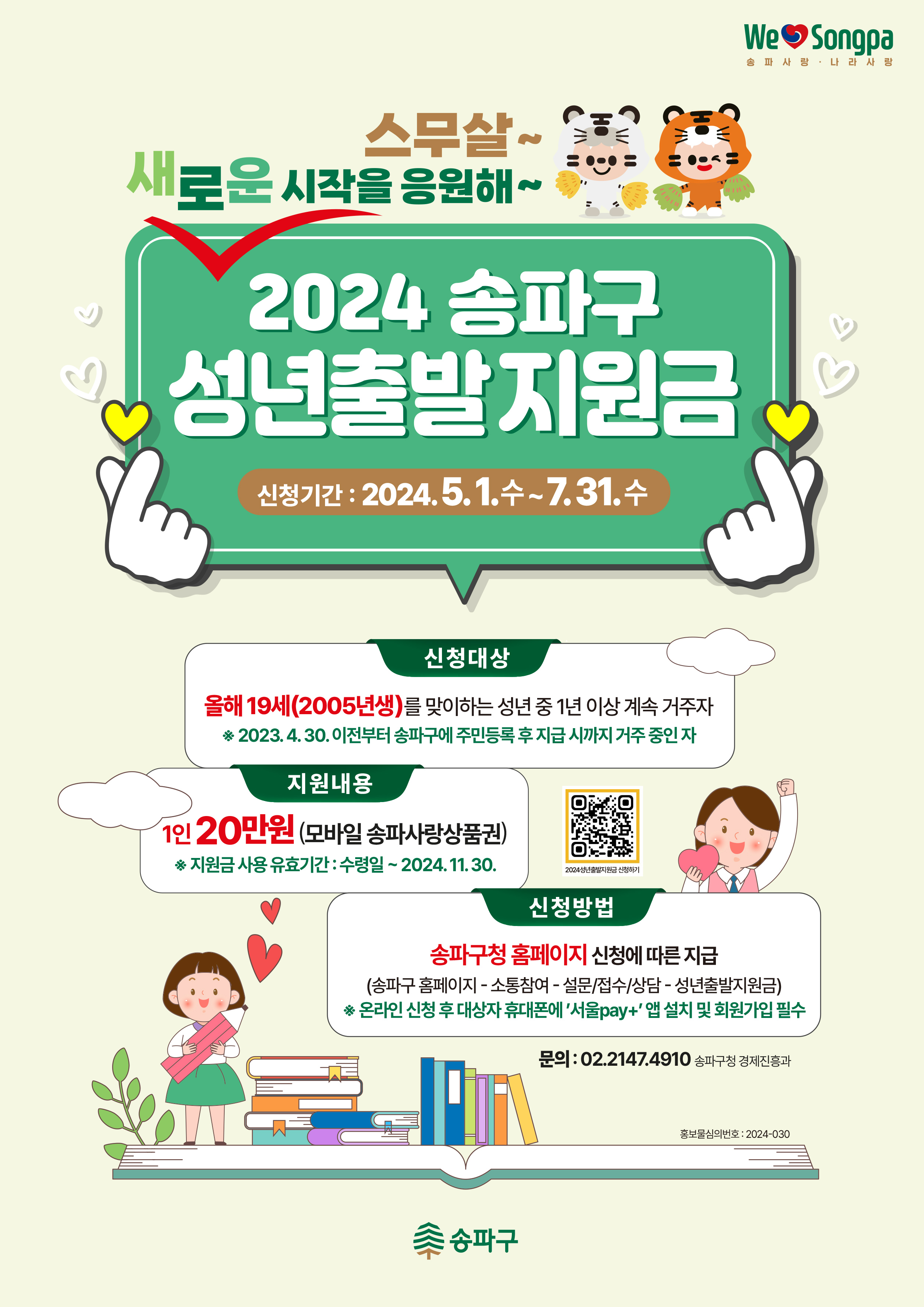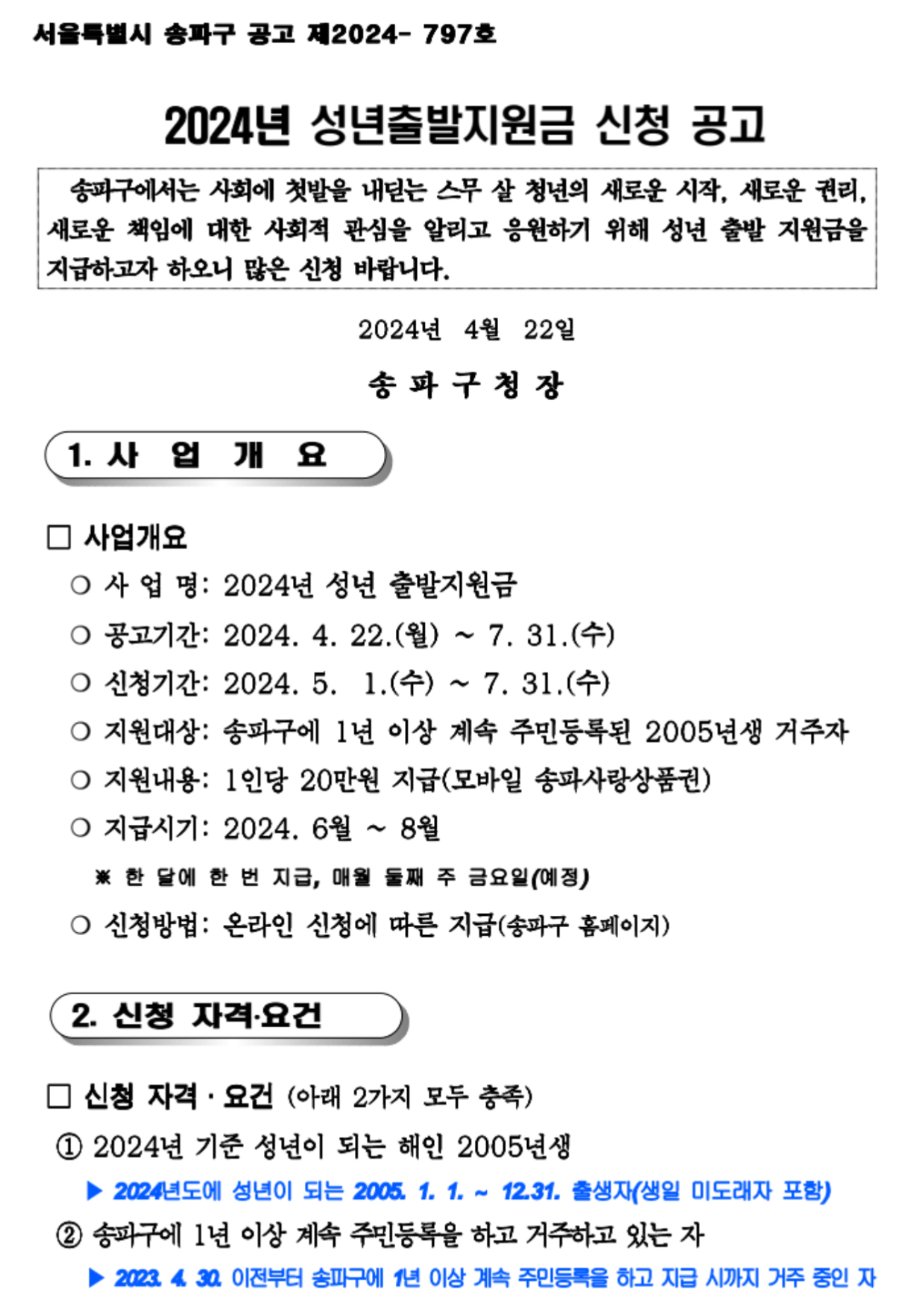 송파구 성년출발지원금 신청은 2024년 5월 1일부터 송파구청 홈페이지에서 가능하며 지원 대상자 요건은 송파구민 중 올해 성년을 맞이한 2005년생(생일 미도래자 포함)으로 2023년 4월 30일 이전부터 지급 시까지 송파구에 1년 이상 계속 주민등록을 하고 거주 중이면 됩니다.