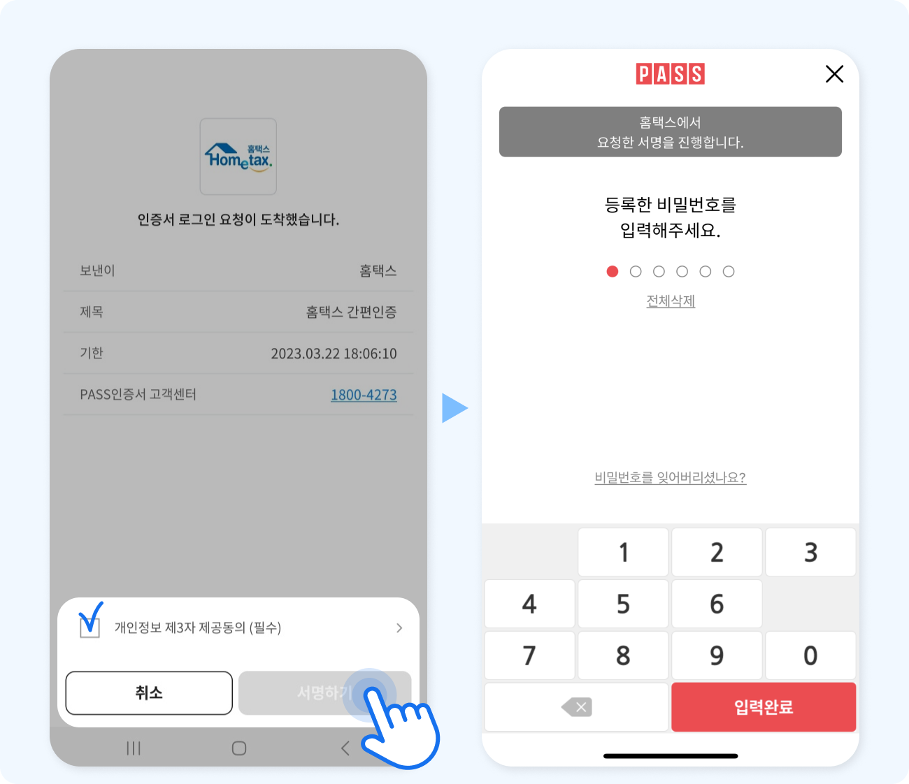 (3) 개인정보 제3자 제공동의(필수) 체크 ▶ [서명하기] 클릭 ▶ 비밀번호 입력