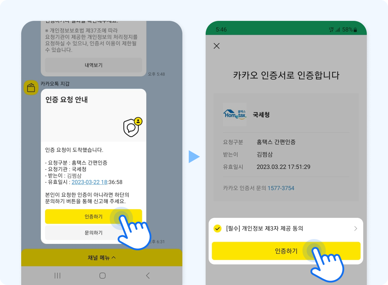 ※ 카카오 인증서에 등록된 이름과 동일하게 입력해야 간편인증이 진행