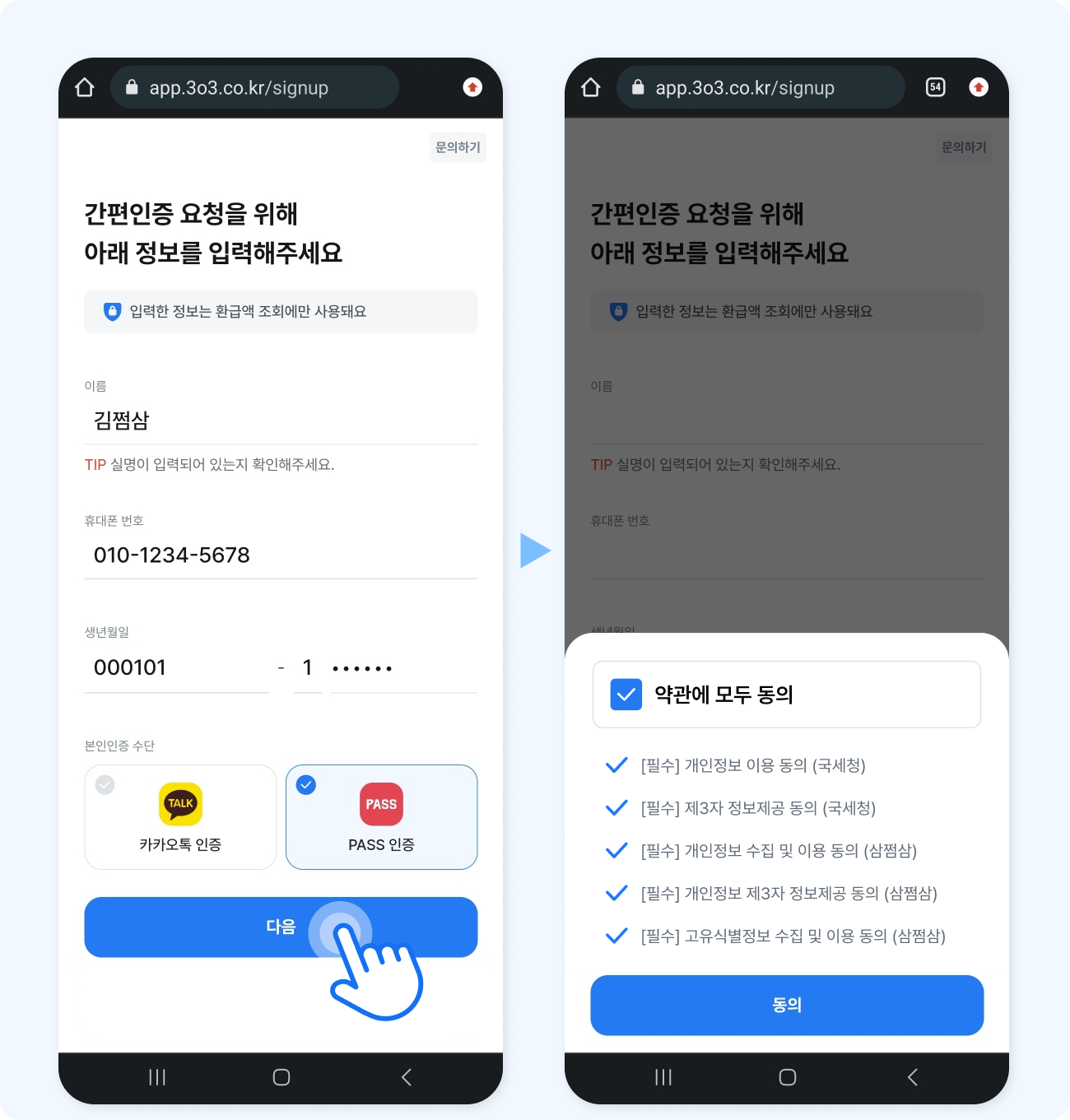 (1) 이름/휴대폰번호/생년월일 입력 ▶ 카카오톡 인증 선택 ▶ [다음] 클릭! ▶ 약관에 모두 동의 체크 ▶ [동의] 클릭!