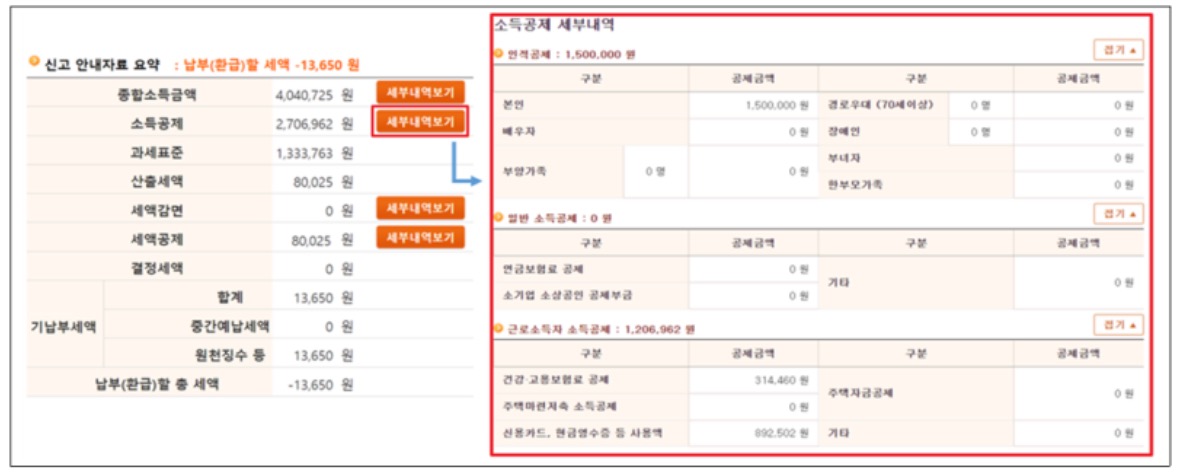모두채움 서비스 대상자가 홈택스 및 손택스에서 소득금액 및 공제감면 세부 내역을 한 번에 확인할 수 있도록 하였습니다.