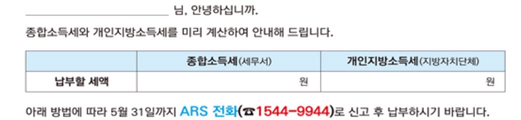 안내문에서 제공하는 바로가기링크(ARS•손택스)를 이용하면 간편히 신고를 마칠 수 있으니 모바일 안내문을 반드시 확인하시기 바랍니다.