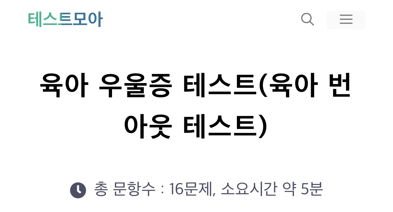최근 ‘금쪽 같은 내새끼’ 프로그램이 유행하면서 자신도 육아 우울증 혹은 육아 번아웃인지 궁금해하는 사람이 늘어나고 있는데 테스트모아에서 총 16가지 질문에 가볍게 답해보면서 본인이 육아 우울증이 맞는지 아닌지 테스트해 볼 수 있는 게 나와서 소개드리려 합니다.
