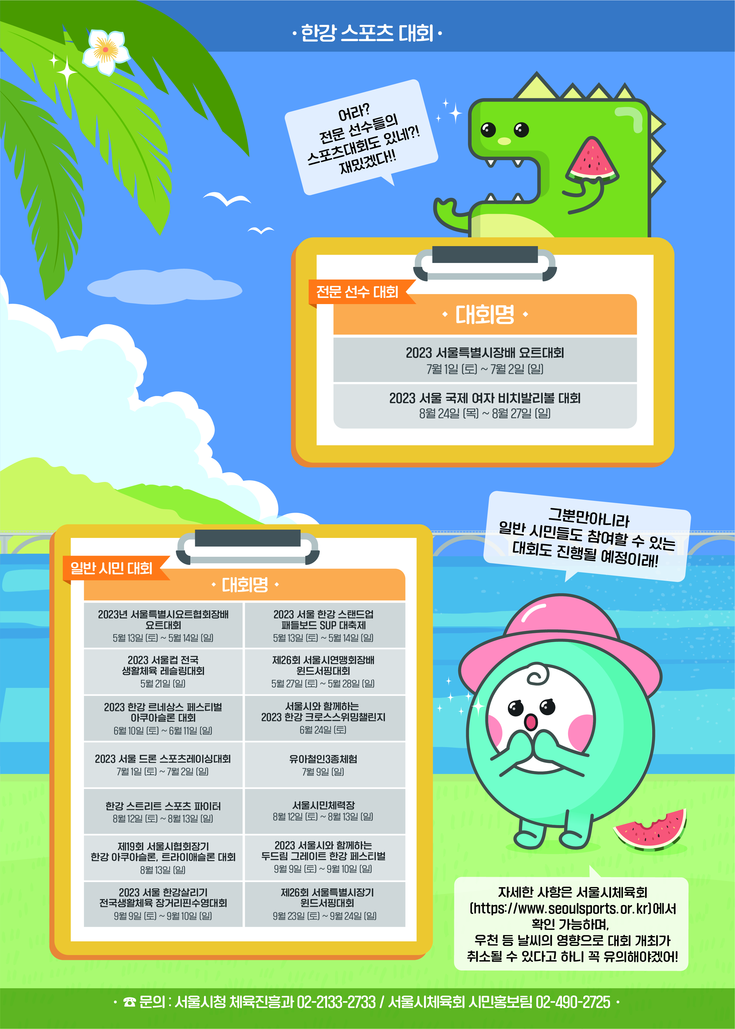 한편, 서울시는 일반 시민들을 대상으로 하는 수상대회 및 프로그램 외에도 전문선수들이 참가하는 국내·국제대회를 한강에서 개최하는데 2023년 7.1.(토)~2.(일) 반포한강공원(더리버마리나)에서는 국내선수들을 대상으로 하는 “2023 서울특별시장배 요트대회”가 2023년 8.24.(목)~27.(일) 잠실 한강공원(모래일광욕장)에서는 14개국 100여 명의 국내·외 선수들이 참가하는 “2023 서울 국제 여자 비치발리볼 대회”가 개최된다고 합니다.