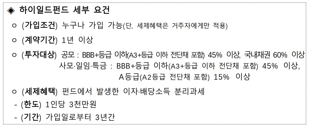 다가오는 2023년 6월 중순부터 분리과세 혜택이 적용된 하이일드펀드·일임·신탁(이하 ‘하이일드펀드’) 가입이 가능합니다.