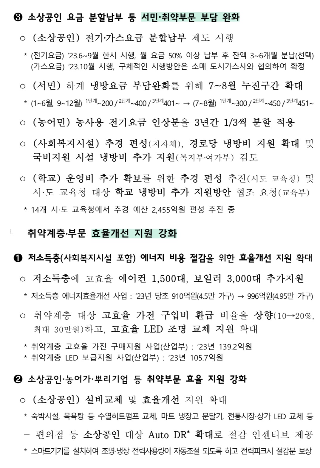 소상공인 분할납부와 여름철(2023년 7~8월) 누진구간 확대를 시행하고 특히 사회복지시설과 학교 등 취약시설에 대한 냉방비 지원을 확대하기 위한 방안을 소관 관계부처에서 검토할 계획이라고 합니다.