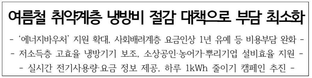 정부는 최근 전기요금 인상에 따른 취약계층과 취약부문의 여름철 냉방비 부담을 최소한으로 줄이기 위해 다양한 지원정책을 선제적으로 추진해 나갈 계획이라고 밝혔습니다.