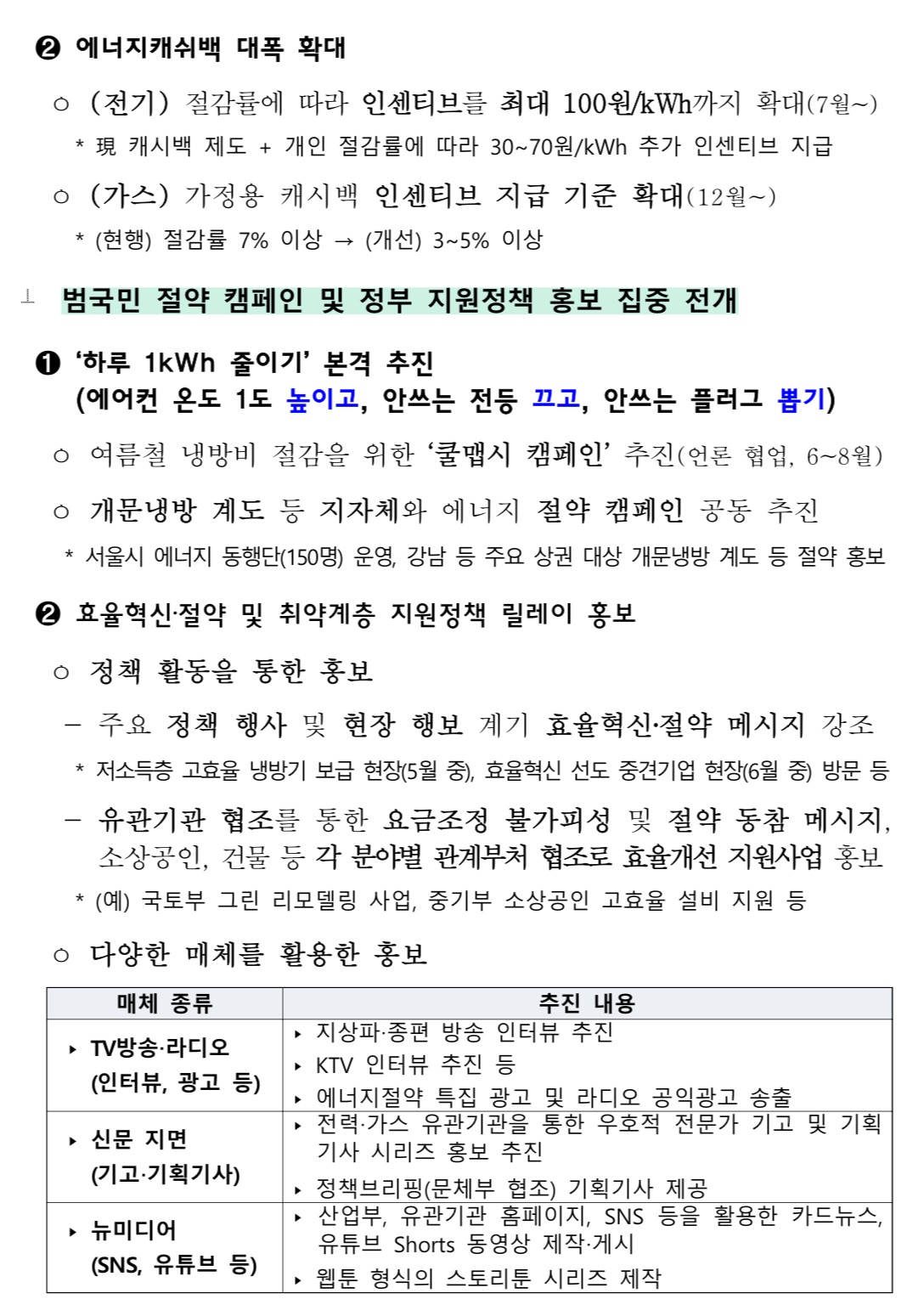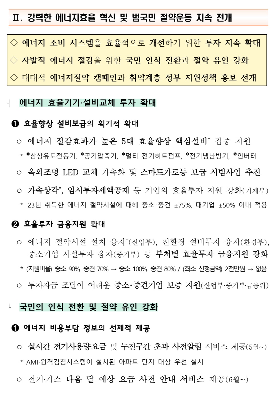 정부는 2023년 5월 19일 총리 주재 국정현안관계장관회의에서 이러한 방안을 담은 ‘에너지 이용 취약계층 지원 및 효율혁신‧절약 추진방안’을 논의하고, 국민들의 에너지 비용부담 최소화와 효율혁신‧절약에 모든 부처가 총력을 기울이기로 하였습니다.