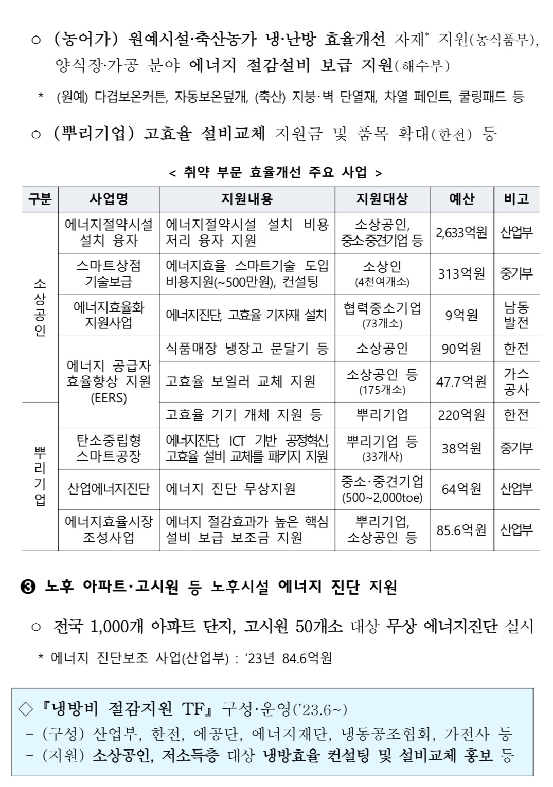 다음으로 취약계층과 부문의 근본적인 에너지 비용 절감을 위한 효율개선 지원을 강화합니다.