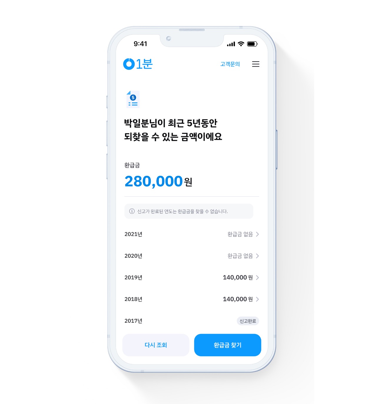 1분 환급은 납세자의 신고에 따라 국세청에서 진행되기 때문에 환급 세액 차이가 발생하지 않으며 만약 환급 세액에 차이가 발생했다면, 증빙 자료를 고객센터로 제출하면 수수료를 재정산하여 부분 및 전액 환불이 진행됩니다.