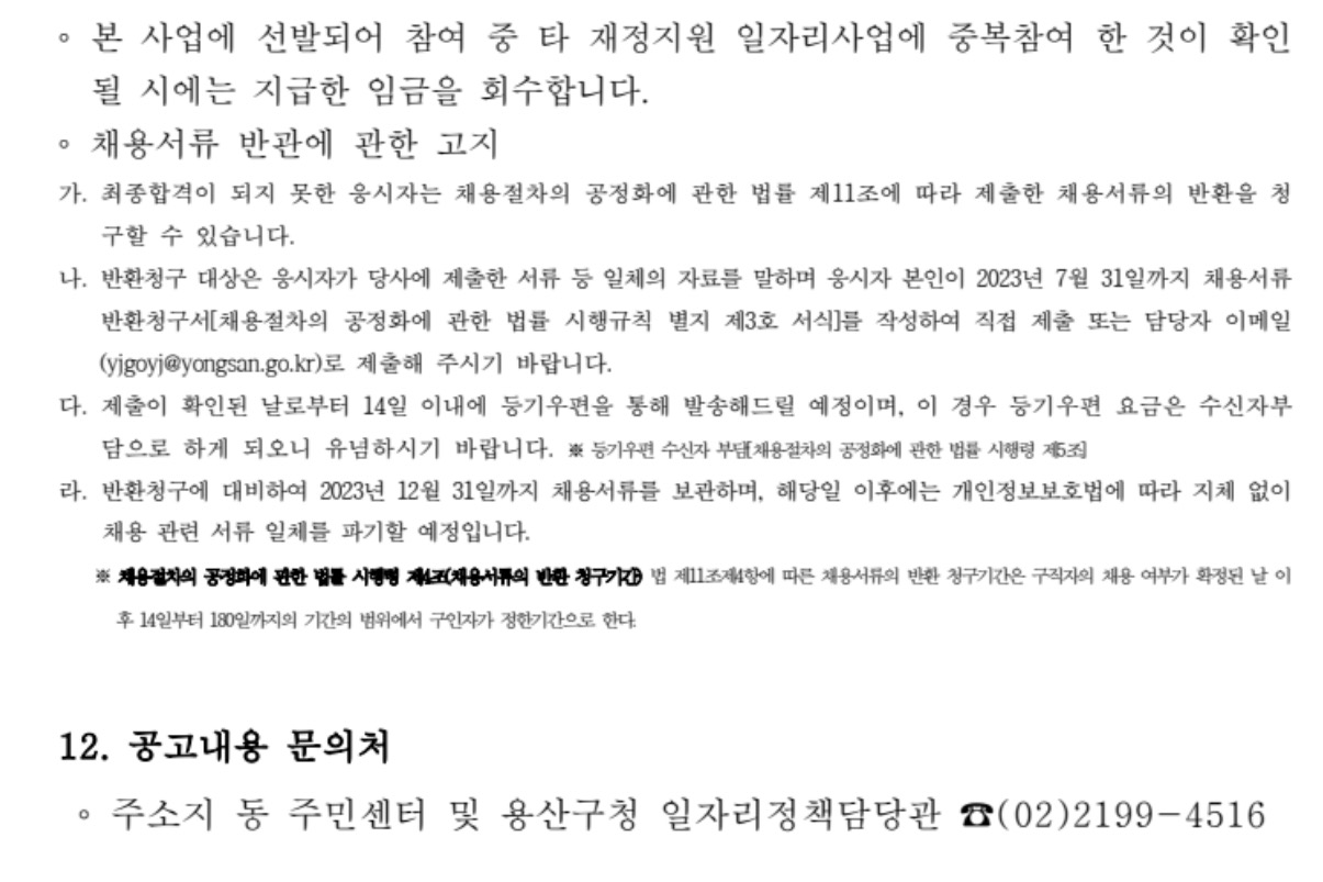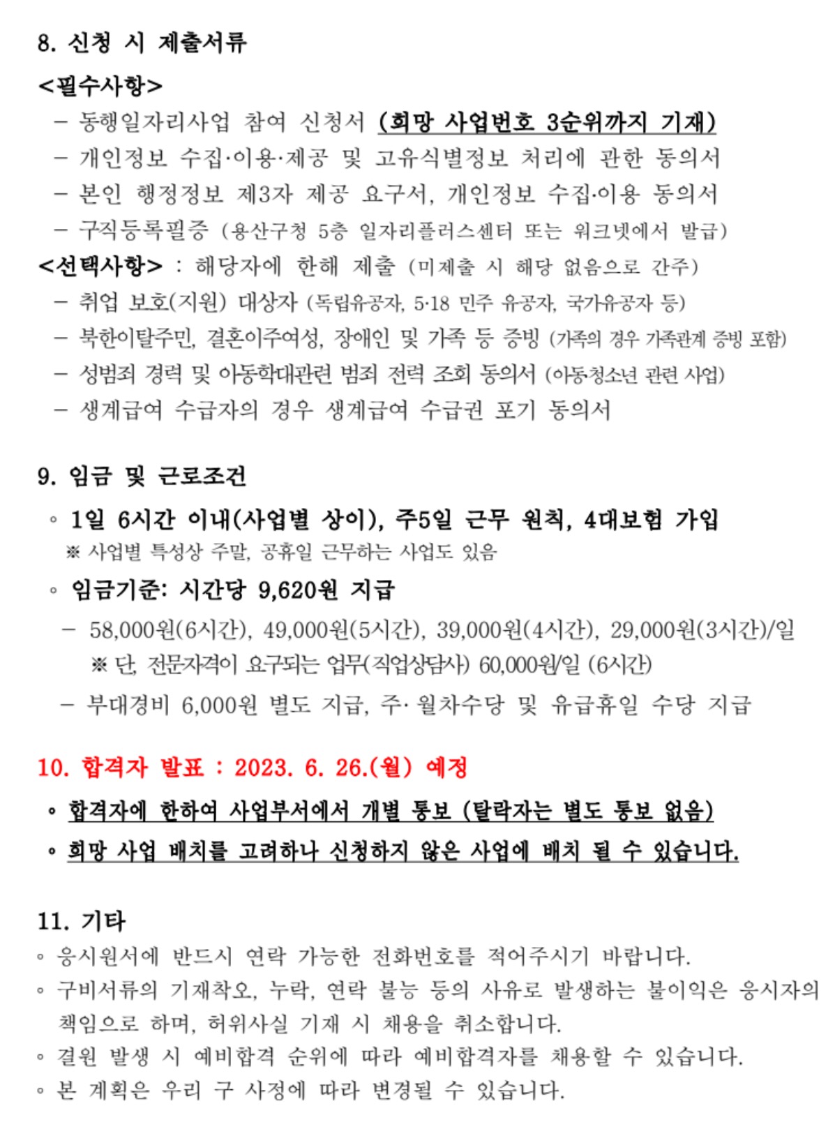 용신구는 사업별 자격 조건과 신청자 재산, 가구소득, 공공일자리사업 참여기간 등을 고려해 대상자를 선발하고 결과는 다음 달 2023년 6월 26일 개별 통지할 예정이라고 합니다.